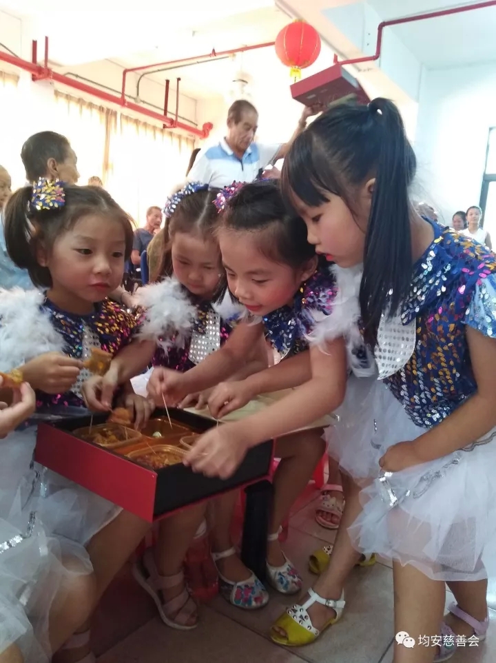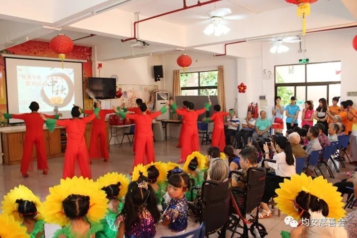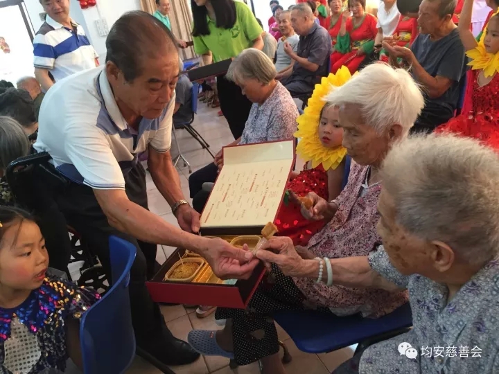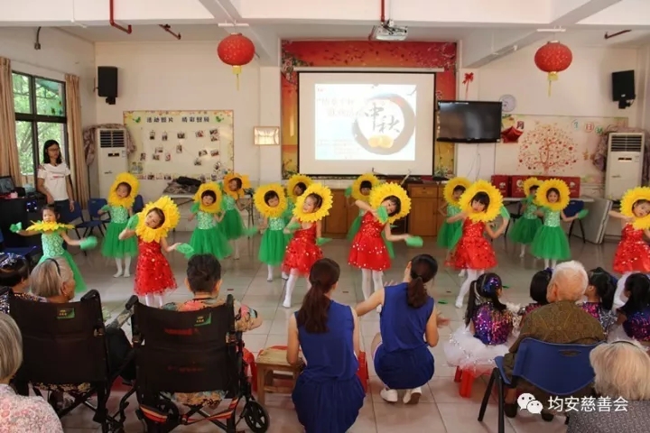 均安镇老年人大学的姐妹们和均安镇乐瑞幼儿园的小朋友们准备了精彩的文艺节目献给老人们,精彩的表演赢得了老人们热烈的掌声和欢笑声。表演期间,工作人员与老人们进行互动,与他们一起品赏我们准备的月饼,提前庆中秋,画面温情无限。
